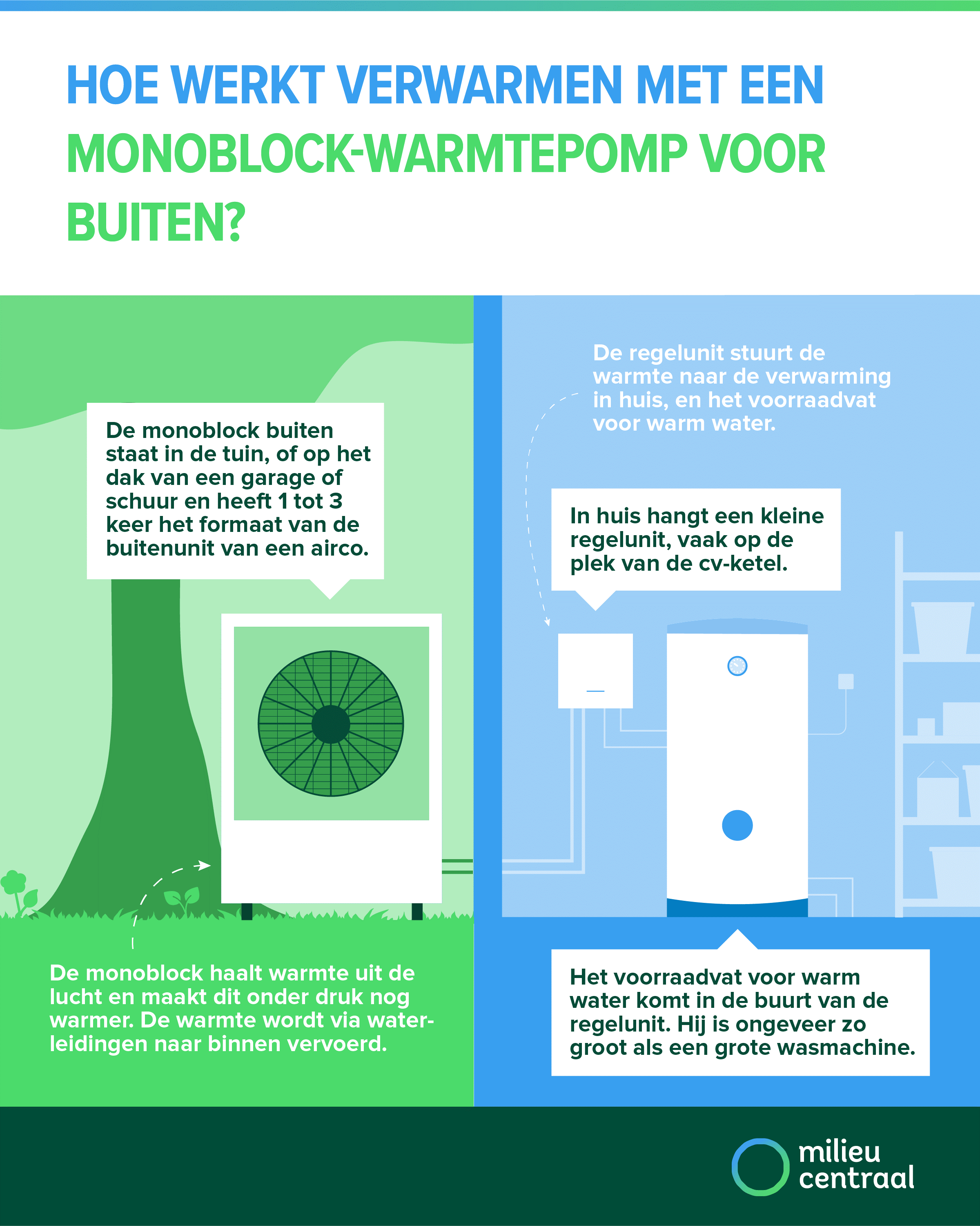 Een monoblock is er in een hybride variant (waarbij hij samenwerkt met de cv-ketel) en als all-electric. Bij volledig elektrisch gebruik is ook ruimte nodig voor een voorraadvat voor warm water. Deze is vaak in hetzelfde apparaat verwerkt. Daarbij is ook redelijke of goede isolatie van de woning een voorwaarde.