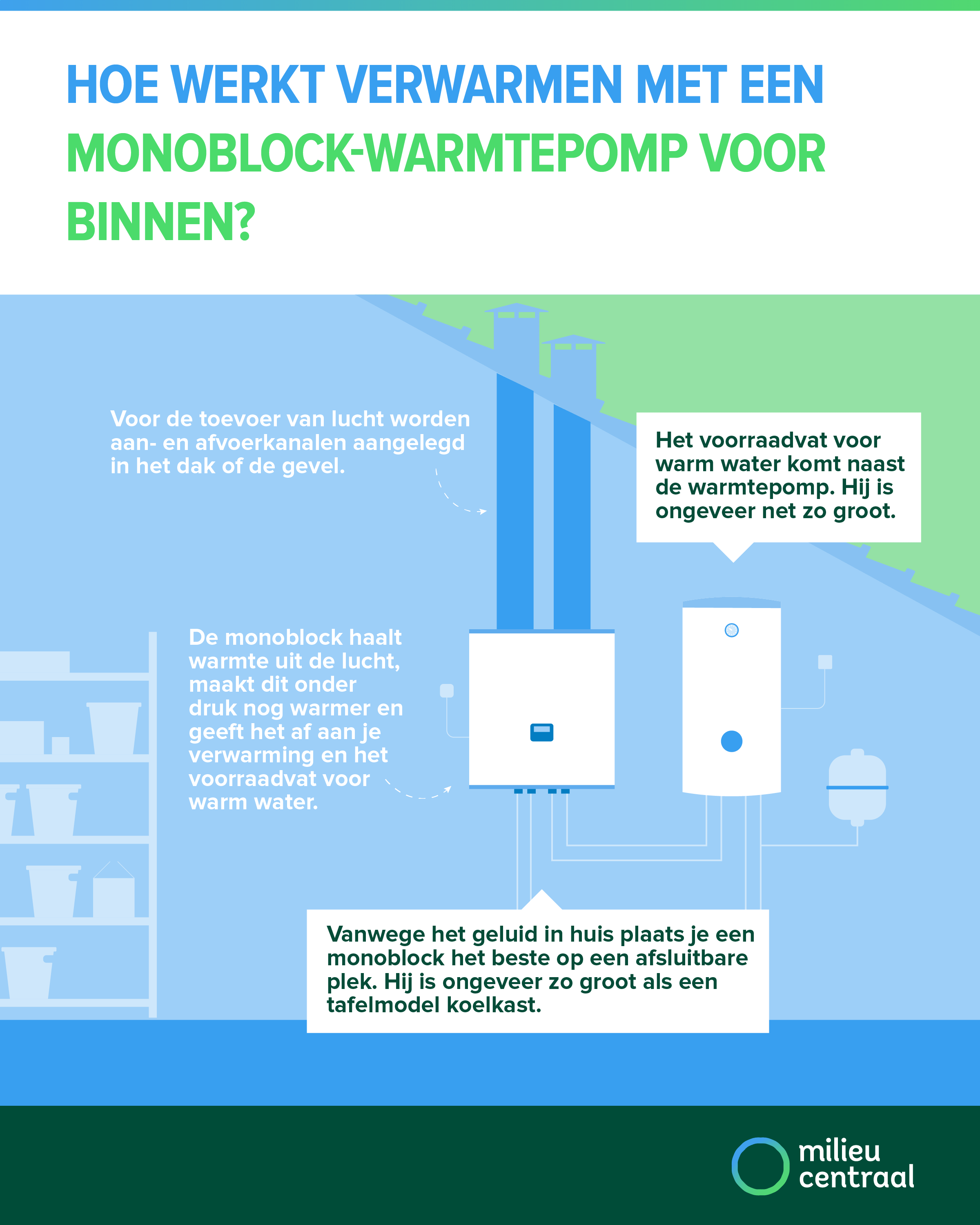 Bij een volledig elektrische monoblock-warmtepomp voor buiten is in huis ook ruimte nodig voor een voorraadvat met warm water. Dat is ongeveer zo groot als een grote koelkast. Heb je die ruimte binnen echt niet, dan zou je het vat ook in een berging of schuur kunnen plaatsen. De leidingen die het huis ingaan moeten in dat geval goed geïsoleerd zijn om zo min mogelijk warmte te verliezen en om geen risico op bevriezing te lopen. Daarbij is ook redelijke of goede isolatie van de woning een voorwaarde.